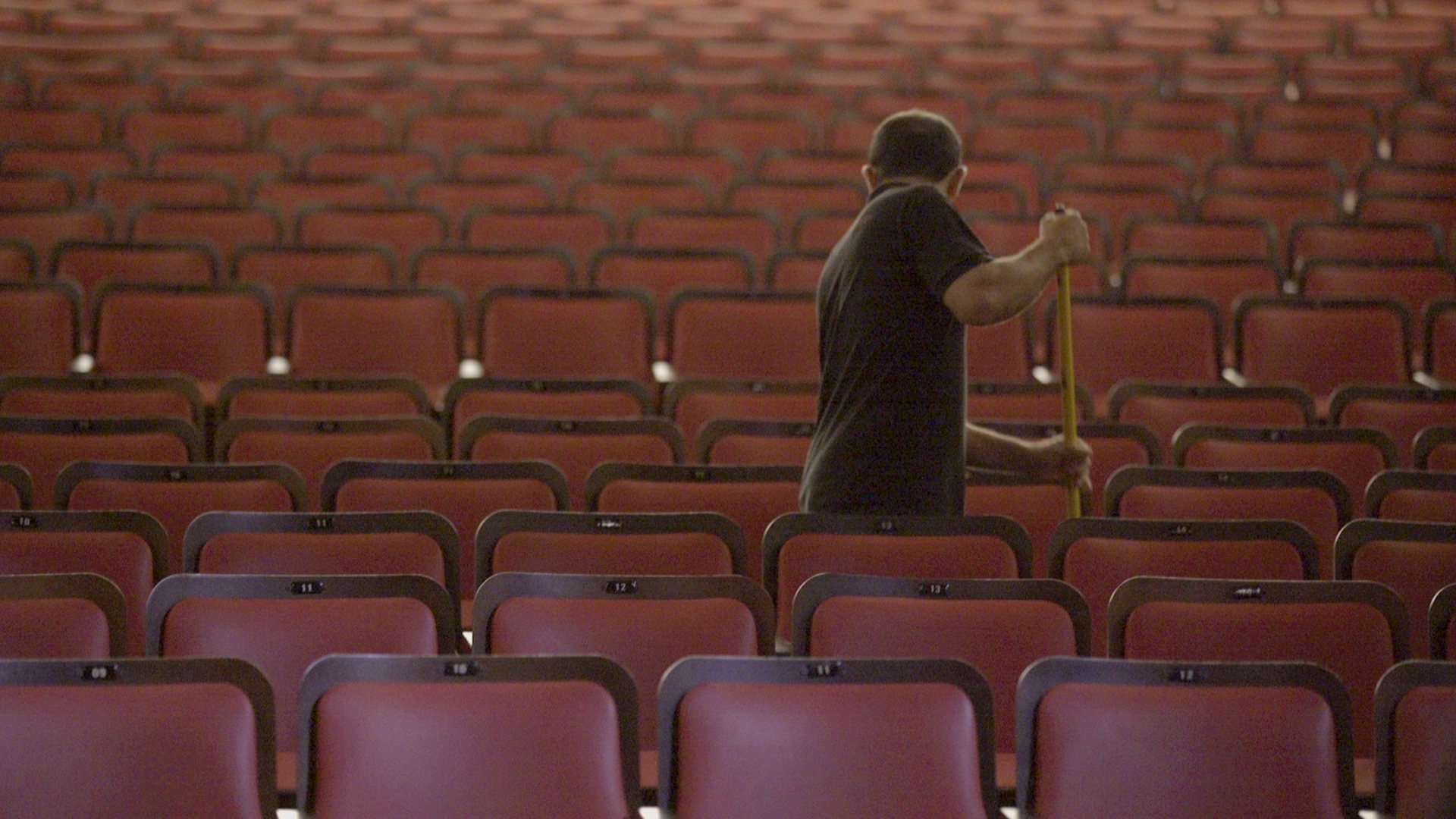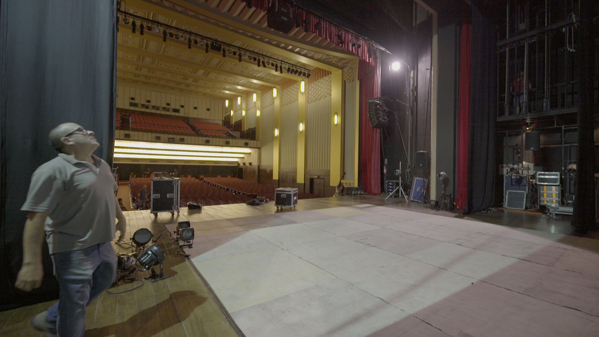 Por trás das cortinas vermelhas.