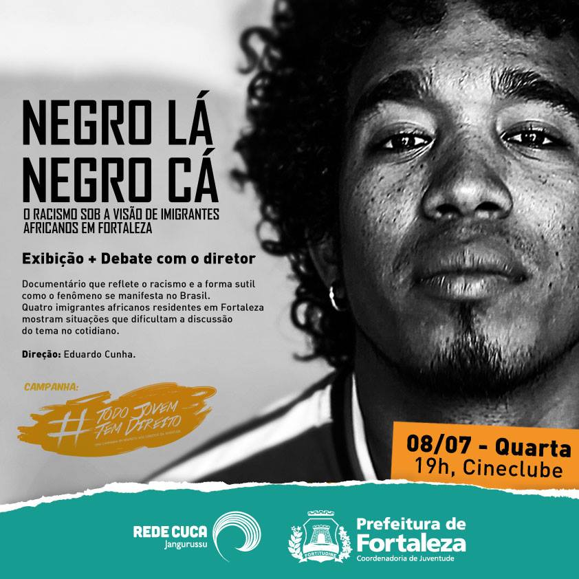 NEGRO LÁ, NEGRO CÁ é um documentário que mostra a visão de quatro imigrantes africanos, residentes em Fortaleza – CE, sobre o que é o racismo e como lidam com a relação de opressão. Através das falas de Alfa Umaro Bari (Guiné-Bissau), Andy Monroy Osório (Cabo Verde), Cornelius Ezeokeke (Nigéria) e Manuel Casqueiro (Guiné-Bissau), podemos nos questionar com relação as formas sutis, porém fortes, nas quais o problema se manifesta, dificultando a discussão sobre o tema.
