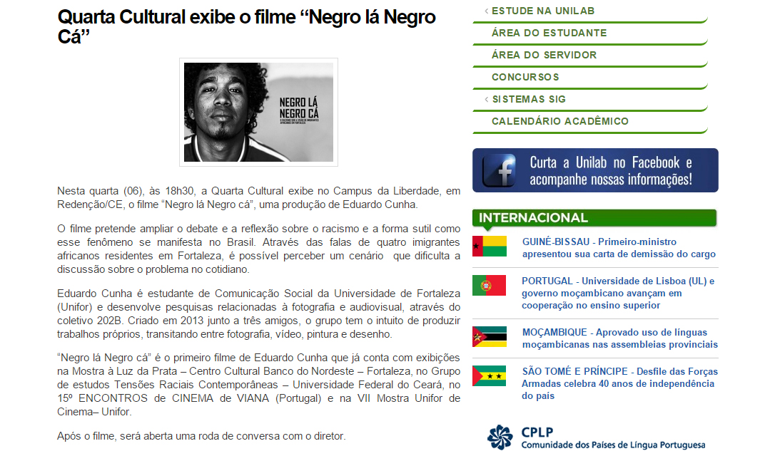 Quarta Cultural – Universidade da Integração Internacional da Lusofonia Afro-Brasileira – UNILAB – Redenção-CE (2015);